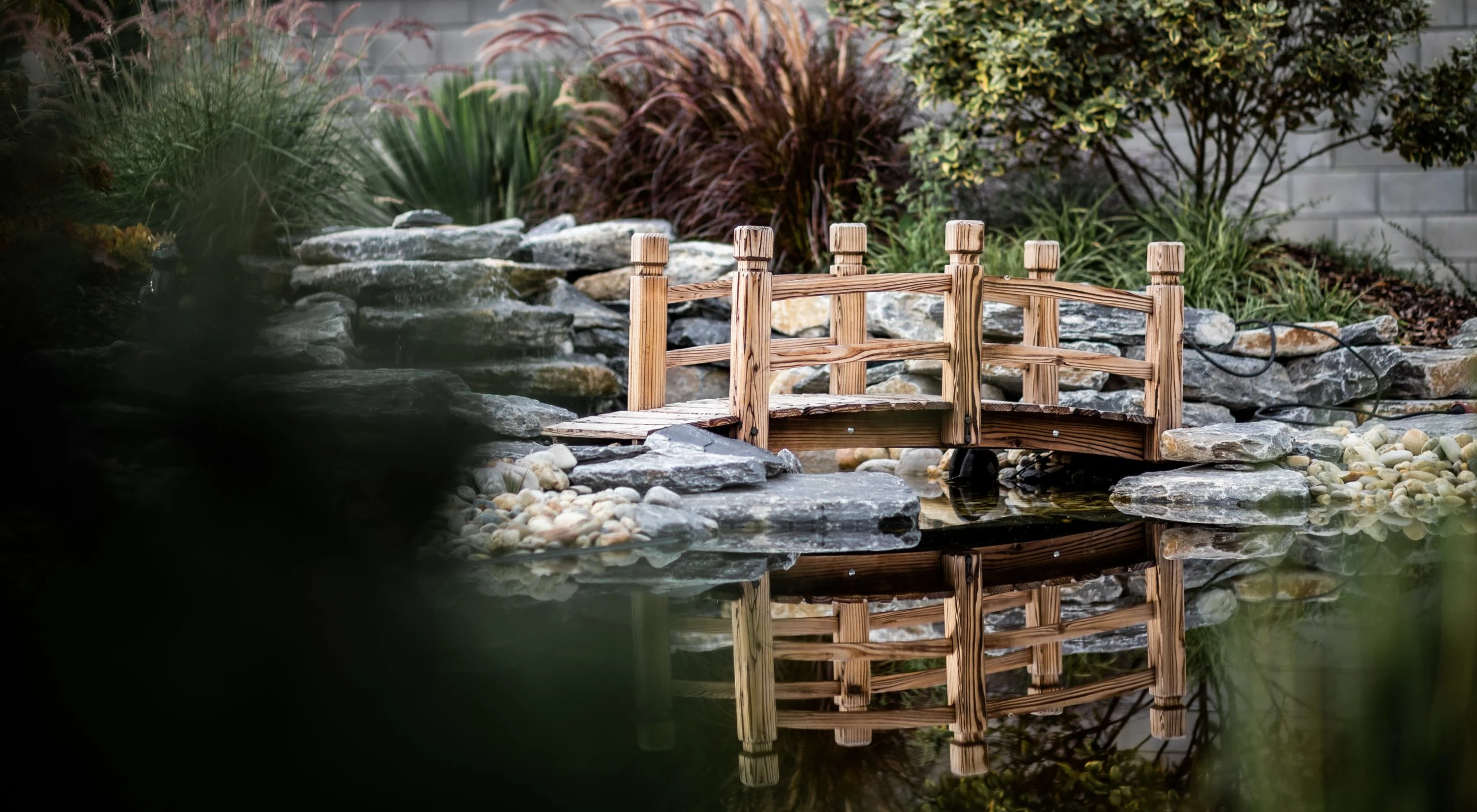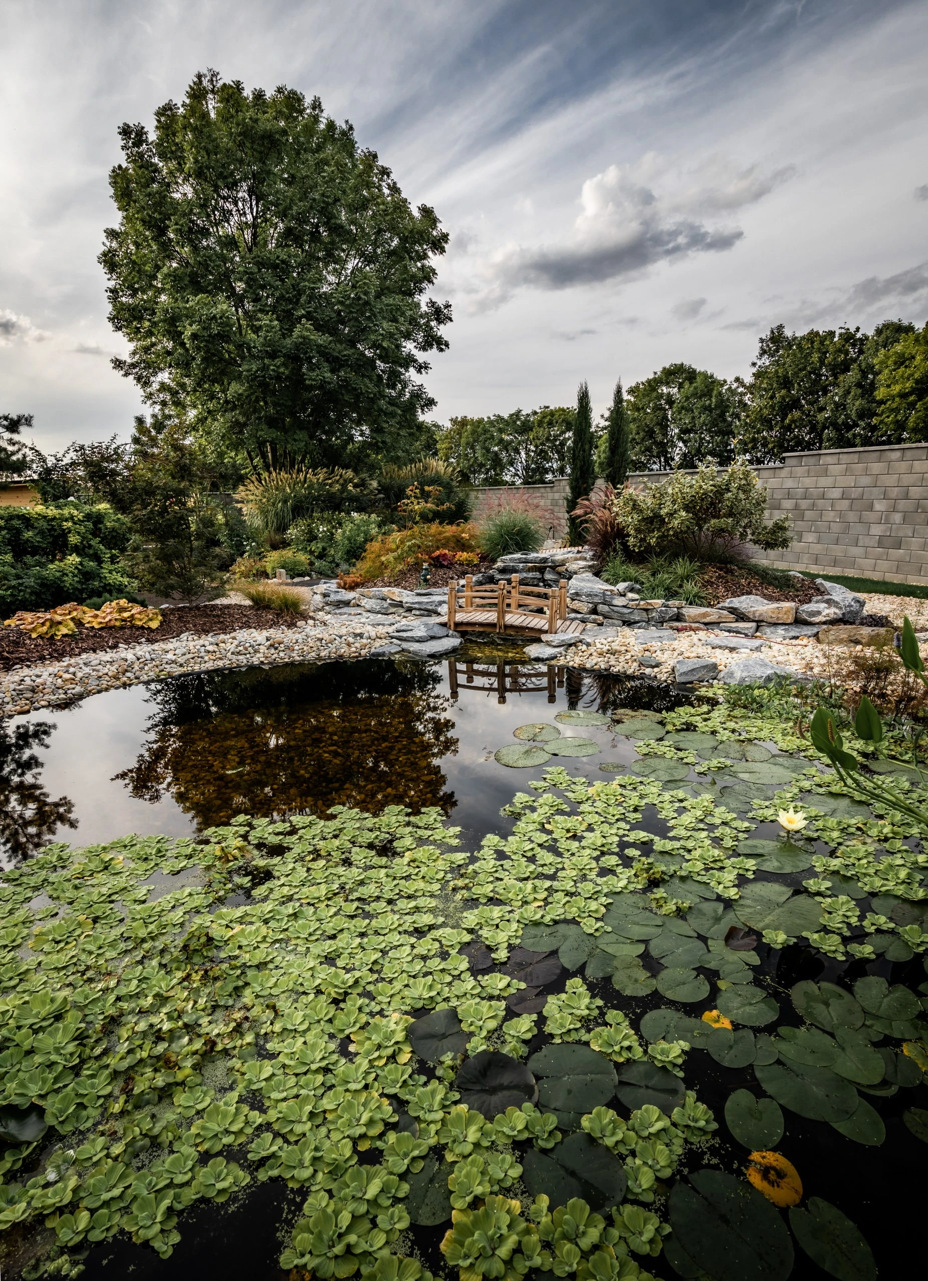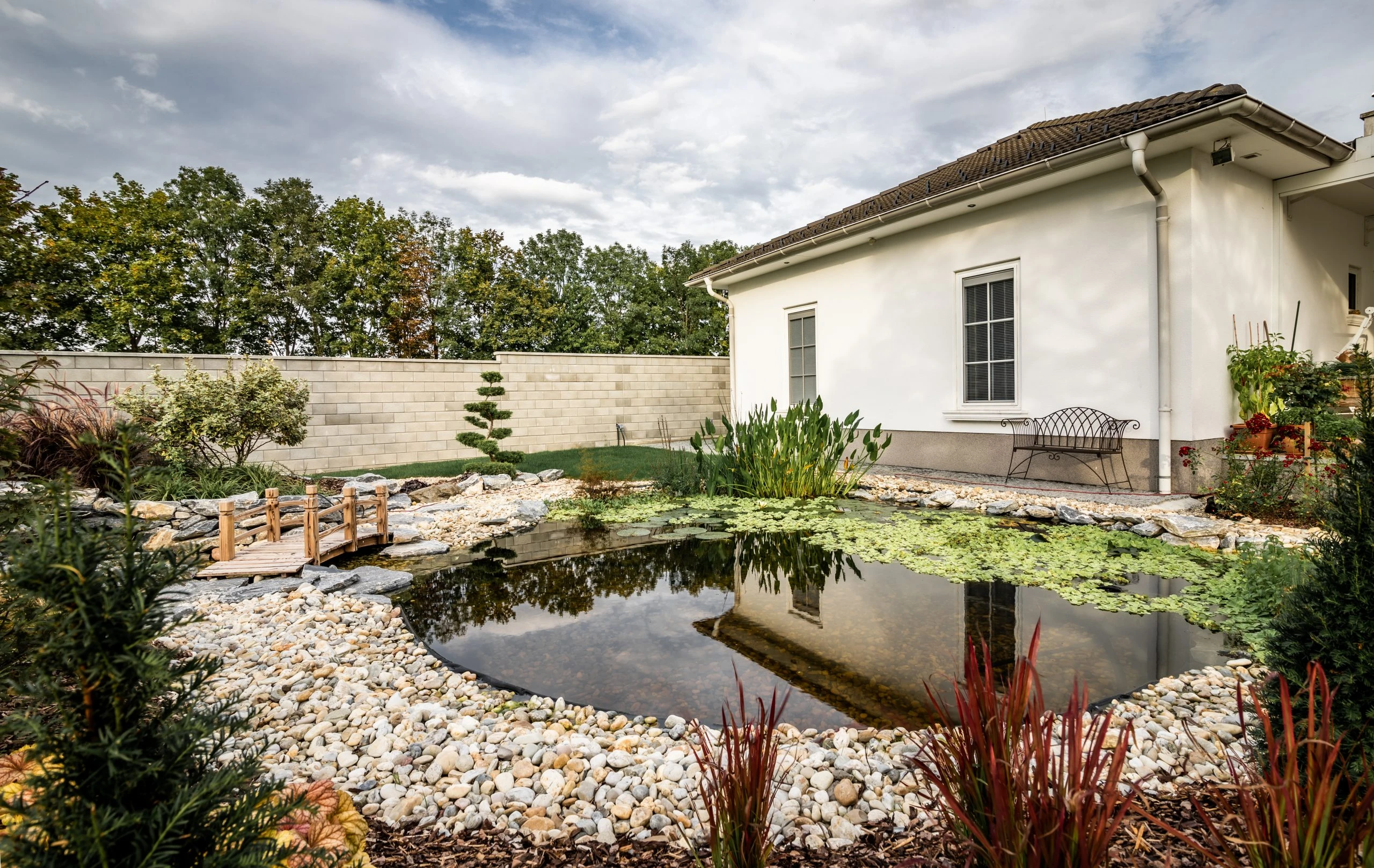 Egy örökölt kert újragondolása 950 m²-en. A központi elem a korábbi medencéből kialakított vízeséses kerti tó, kis híddal – harmonikus, nyugodt atmoszférával. 2022-ben Alsó Ausztria egyik legszebb magánkertjének szavazták meg.