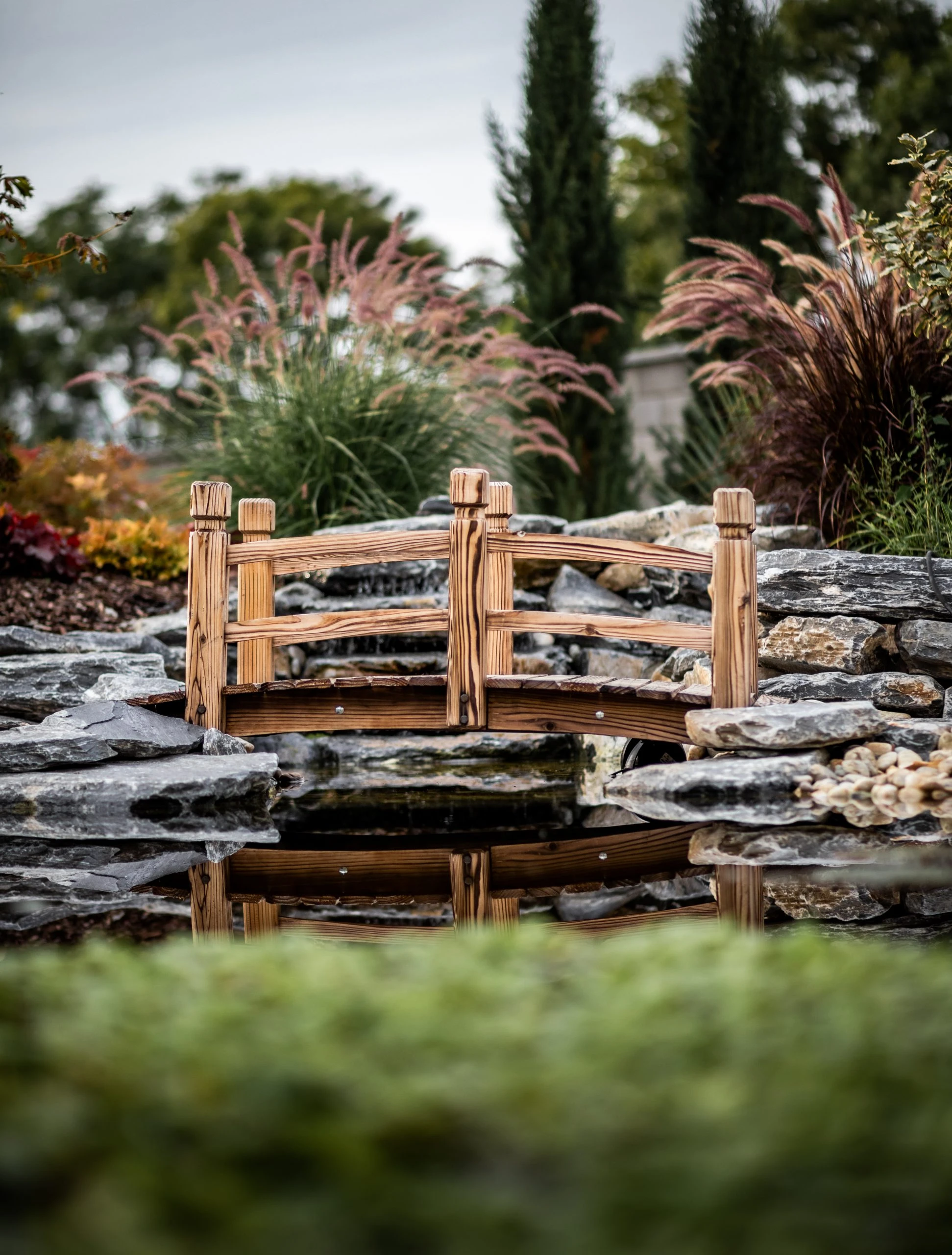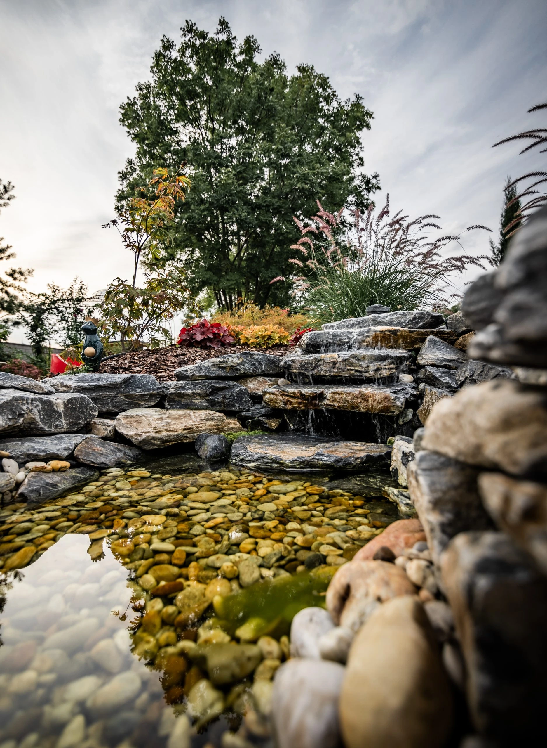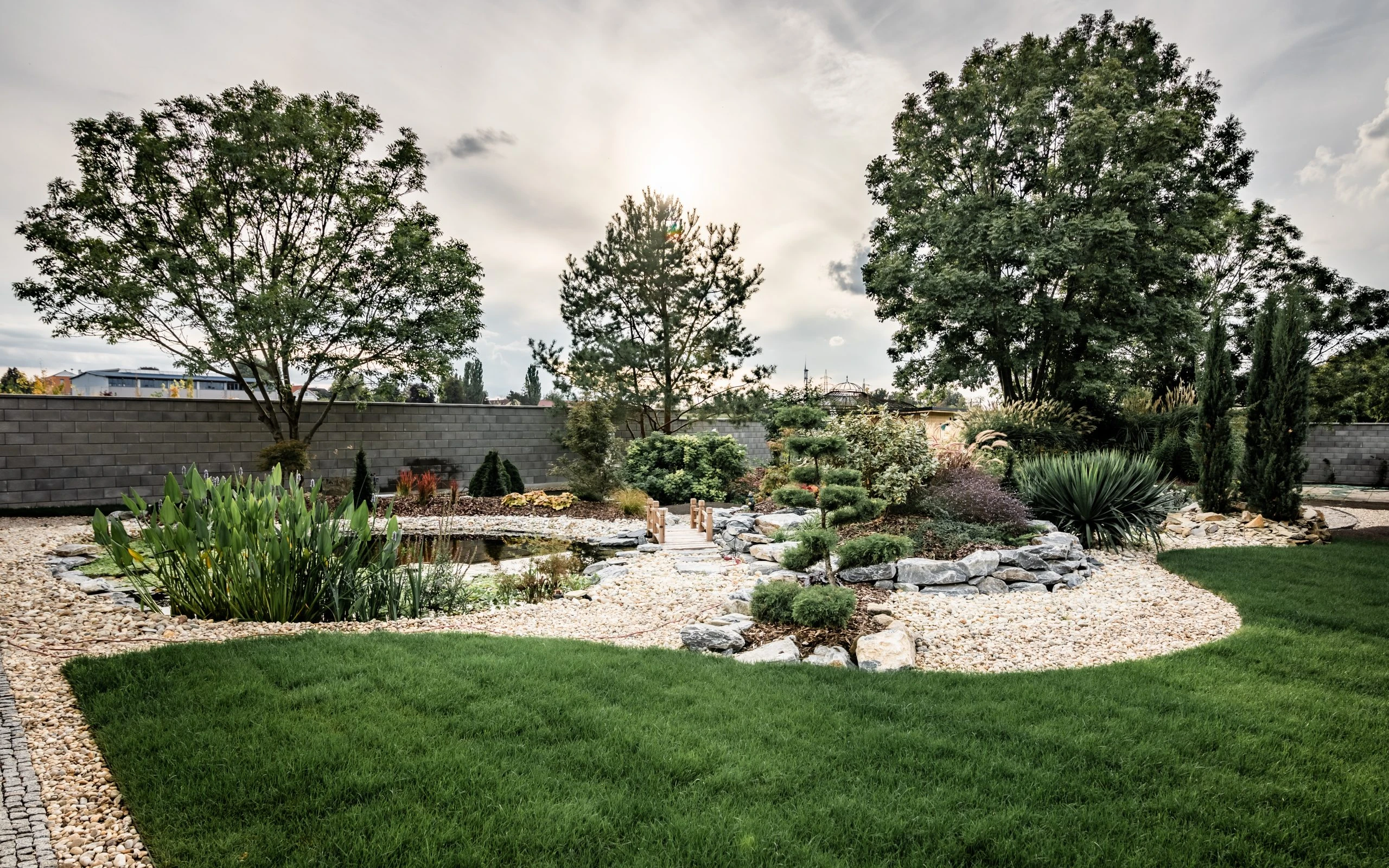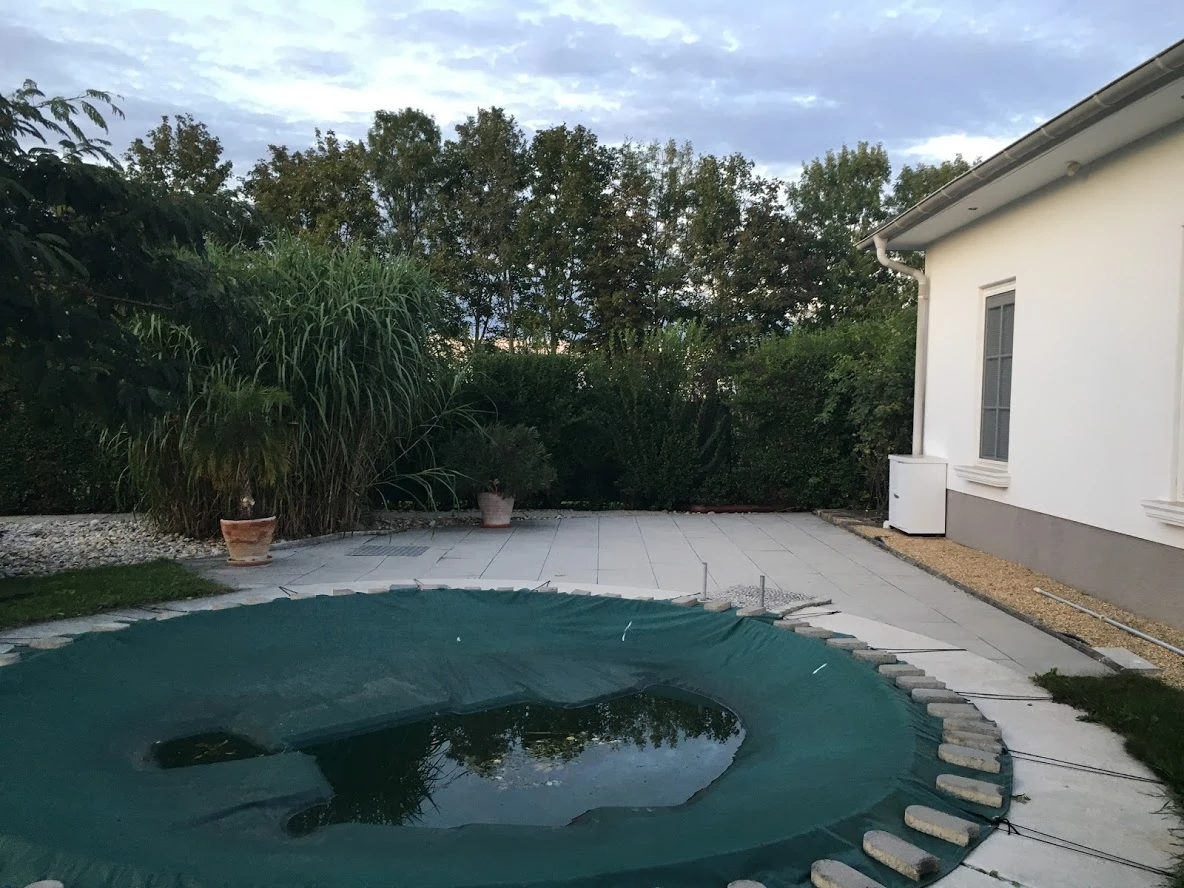 Egy örökölt kert újragondolása 950 m²-en. A központi elem a korábbi medencéből kialakított vízeséses kerti tó, kis híddal – harmonikus, nyugodt atmoszférával. 2022-ben Alsó Ausztria egyik legszebb magánkertjének szavazták meg.
